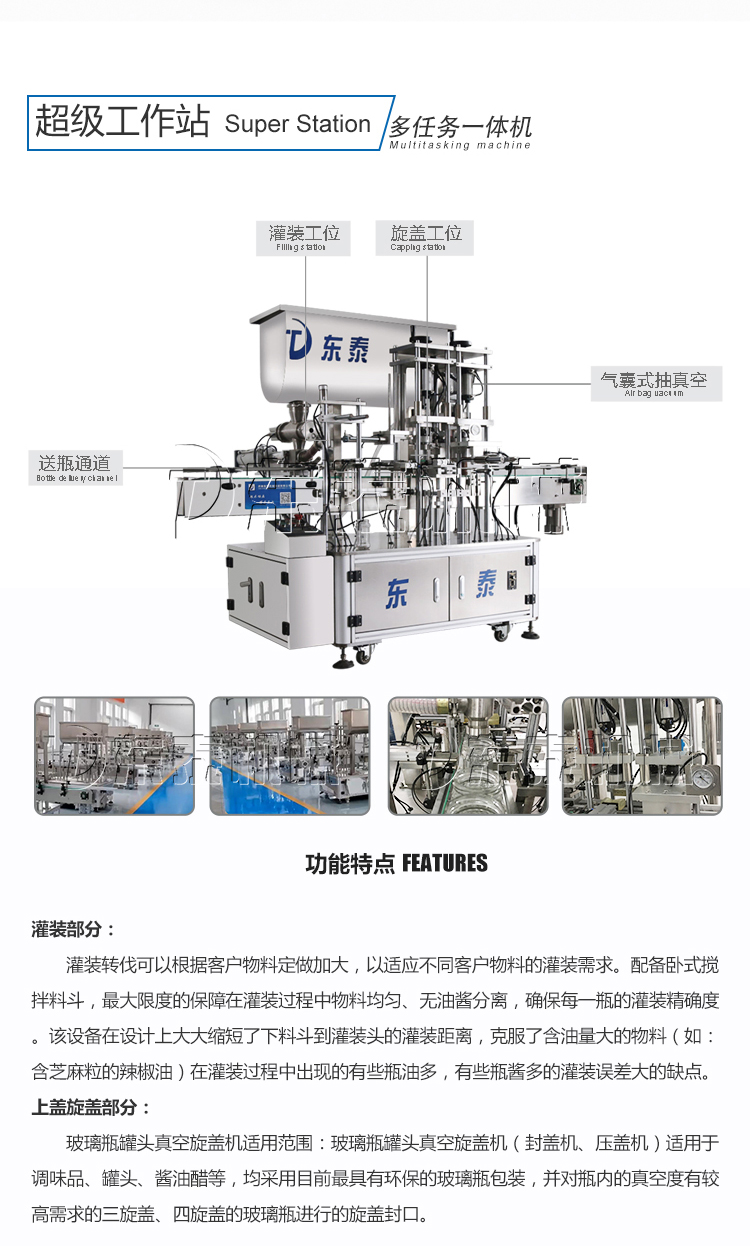 醬類灌裝旋蓋一體機(jī)采用活塞式伺服驅(qū)動(dòng)原理,適用于調(diào)味品中的醬料,濃湯或者帶顆粒并且濃度較大的辣椒醬、豆瓣醬、花生醬、芝麻醬、果醬、濃醬、蜂蜜等較為粘稠醬類的灌裝,自動(dòng)化程度高,機(jī)器能完成自動(dòng)灌裝、自動(dòng)取蓋上蓋,自動(dòng)真空封蓋封口。