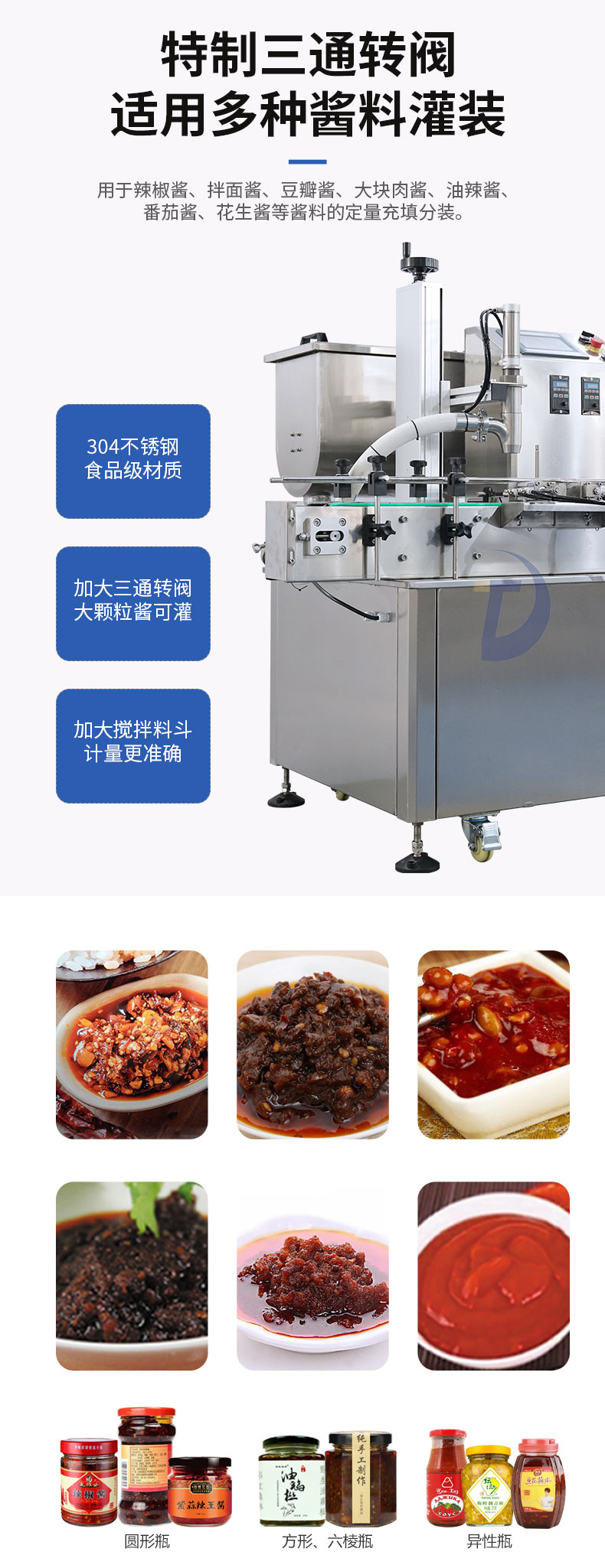 • 小型醬料灌裝生產(chǎn)線 包括半自動(dòng)將料灌裝機(jī) 半自動(dòng)真空旋蓋機(jī)以及半自動(dòng)貼標(biāo)機(jī) 適用于初期辦廠研發(fā)設(shè)計(jì)。灌裝機(jī)用于垃圾愛哦將、拌面醬、豆瓣醬、大塊肉醬等物料的定量灌裝,變...