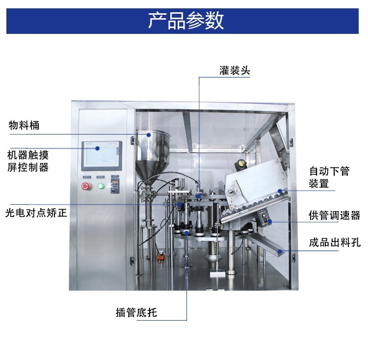 1.適用于醫(yī)藥、食品、化妝品、日用化工等行業(yè),對(duì)復(fù)合管,塑料管,鋁管進(jìn)行灌裝封尾??蓪⒏鞣N糊狀、膏狀、粘度流體等物料順利準(zhǔn)確地注入軟管中,并完成封尾和打批號(hào)、