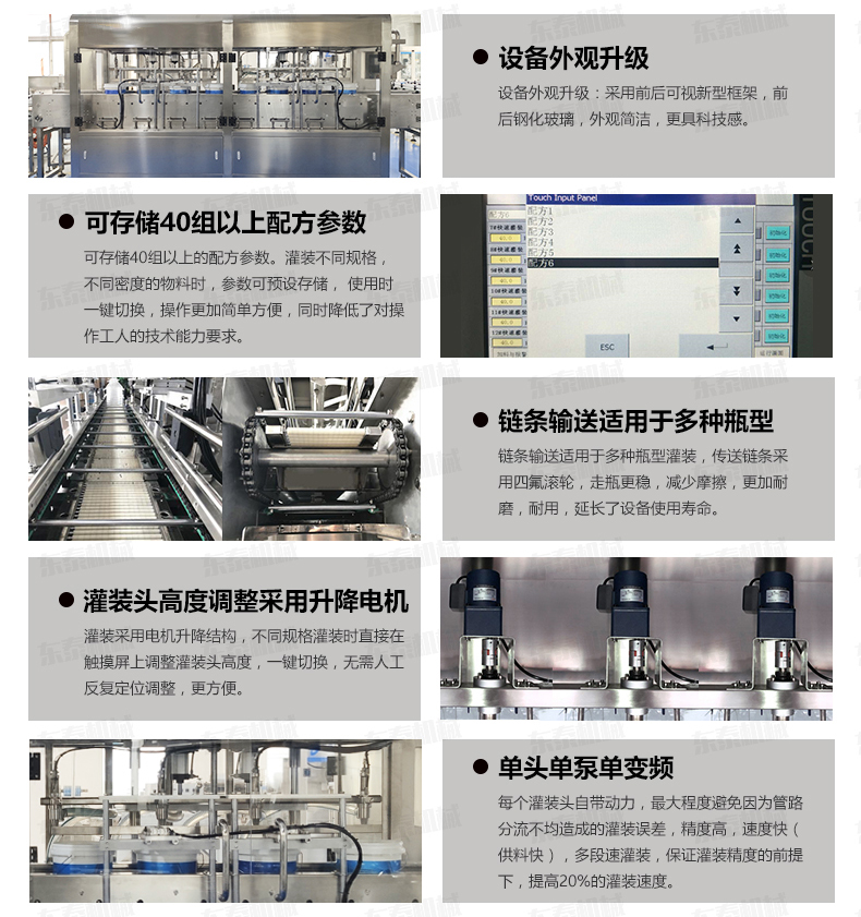 該系列灌裝機(jī)采用容積式計(jì)量灌裝原理,多項(xiàng)專利認(rèn)證,適用于各種規(guī)格(1-5L)的液體肥等液體灌裝。設(shè)備采用伺服驅(qū)動活塞計(jì)量,保證了 1‰的灌裝精度,在保證灌裝精度的同時(shí),提高了 20%-35%的灌裝速度,操作簡單,維護(hù)方便,節(jié)省人工成本,生產(chǎn)效率更高。