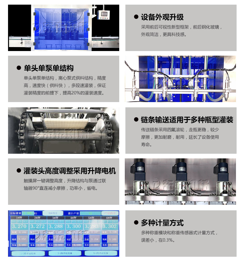 6、采用獨(dú)特的軟硬件設(shè)計,可有效的防止物料滴漏,保證灌裝設(shè)備及包裝容器的清潔。